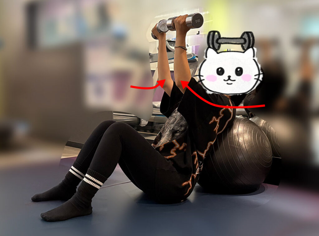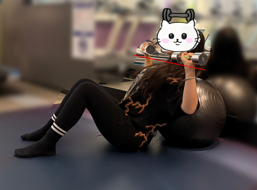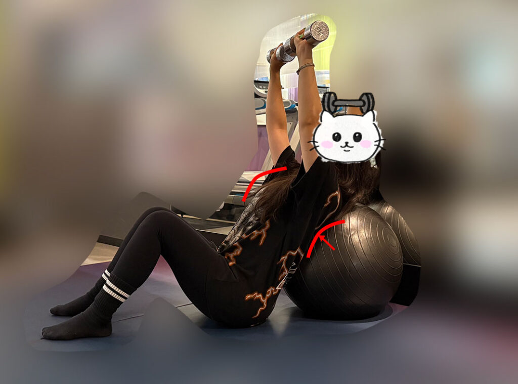①バランスボールの後ろにもたれ、背中をしっかり安定させる。