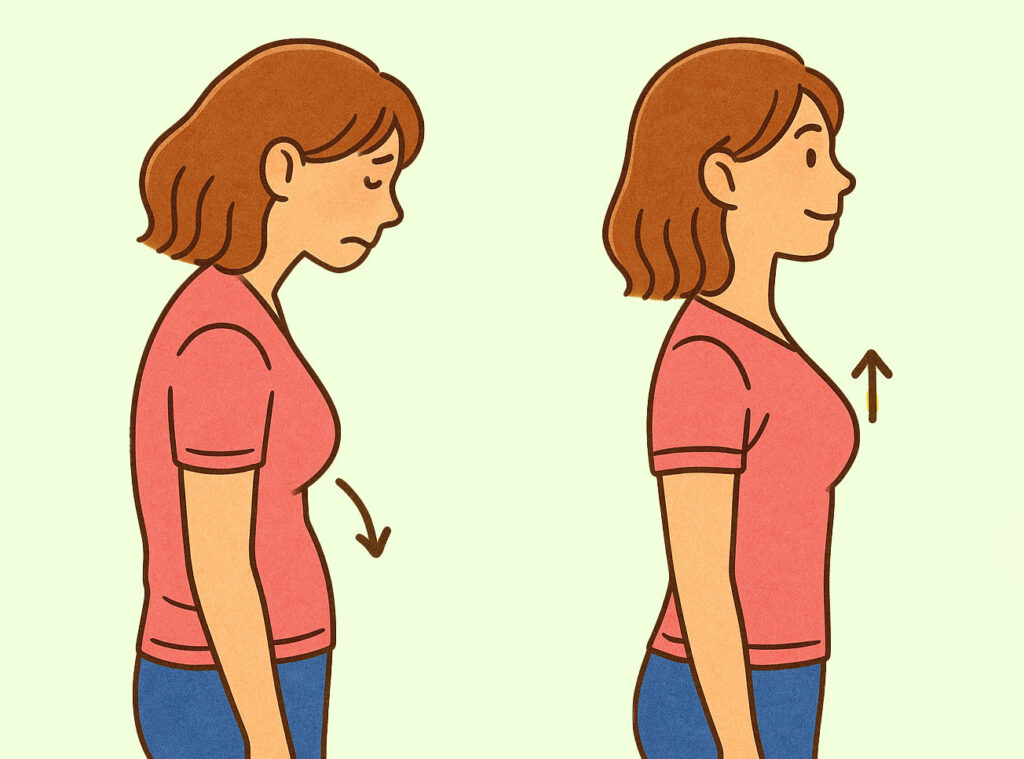巻き肩や猫背姿勢では土台となる大胸筋の向き自体が大きく変化し、下向きのバストとなってしまうから、姿勢改善されるトレーニングやストレッチが効果的です。
